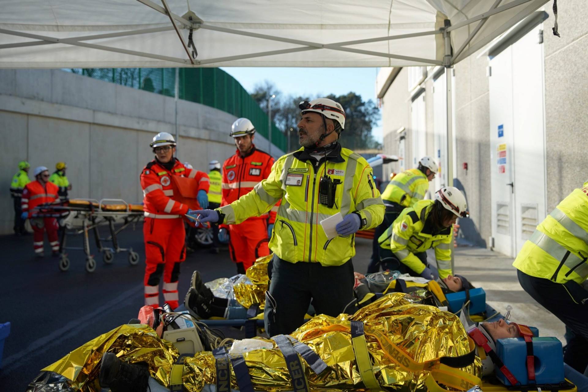 LA SIMULAZIONE – L’esercitazione ha simulato un incidente ferroviario a un treno passeggeri che, partito dalla stazione di Malpensa Terminal2 in direzione Gallarate, entra nella galleria “ Casorate Sempione” e, a causa di un ostacolo sui binari, deraglia. Un treno proveniente in senso opposto, pur azionando il freno di emergenza, si scontra con il treno deragliato con un impatto violento. A seguito dell’incidente lo scenario realizzato ha previsto lo sprigionamento di abbondante fumo, per un principio di incendio, e il blocco di entrambi i convogli in galleria. La presenza del fuoco e delle fiamme costringe i soccorritori a fare evacuare i viaggiatori da entrambe le uscite della galleria. A bordo dei due treni viaggiavano circa 100 figuranti, per rappresentare i passeggeri della corsa anche con casistiche che richiedono assistenza dedicata: una persona in carrozzina e disabili ipovedenti e audiolesi. La simulazione ha previsto il ferimento di 35 viaggiatori a seguito dell’incidente, con diversi livelli di gravità: 2 codice nero (tra cui il macchinista del treno proveniente da Gallarate), 5 in codice rosso, 10 in codice giallo, 18 in codice verde.