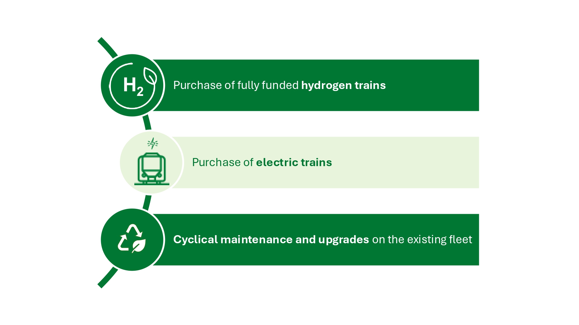 - Introduction/replacement of electric fleets for trains and buses and new hydrogen-powered trains, phasing out diesel trains