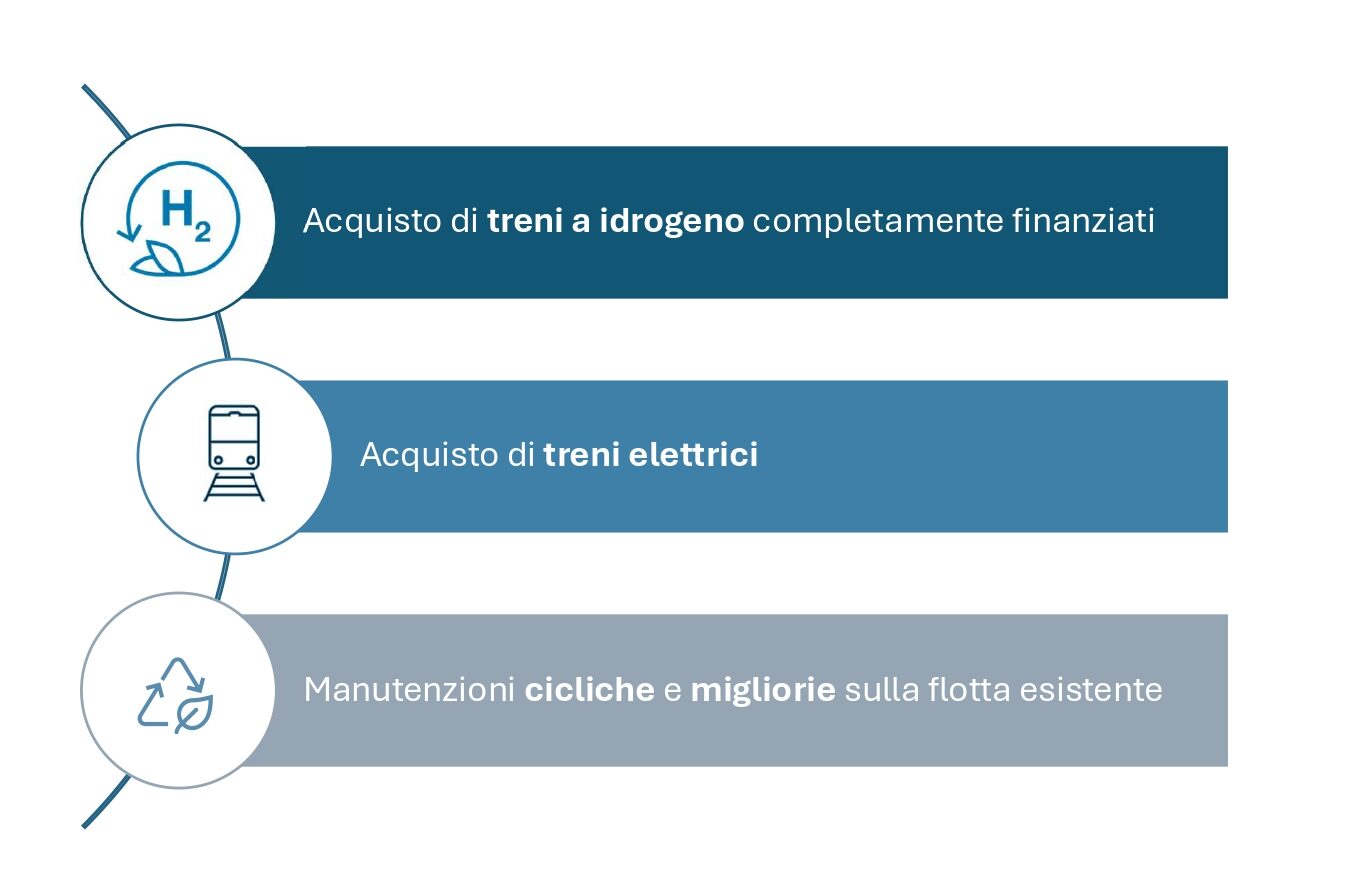 - Idrogeno: 14 treni H2 +3 impianti produzione +4 stazioni rifornimento treni +5 stazioni rifornimento stradale