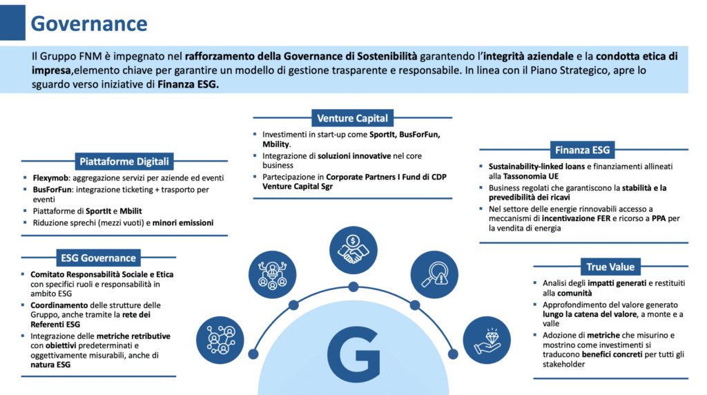 Il Gruppo FNM è impegnato nel rafforzamento della Governance di Sostenibilità garantendo l’integrità aziendale e la condotta etica di impresa, elemento chiave per garantire trasparente e responsabile. In linea con il Piano Strategico, apre lo sguardo verso iniziative di Finanza ESG.