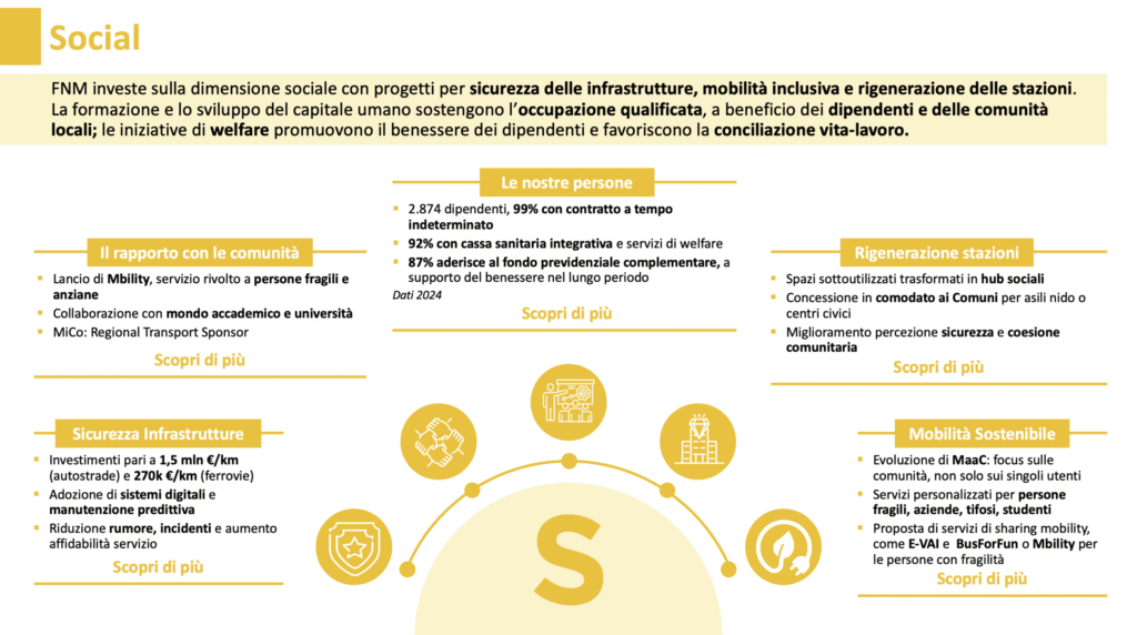 In FNM, la dimensione Sociale è il motore che dà senso alle nostre azioni quotidiane: rappresenta l’impegno verso le persone, le comunità territoriali e gli stakeholder, affinché la crescita economica vada di pari passo con il benessere collettivo.